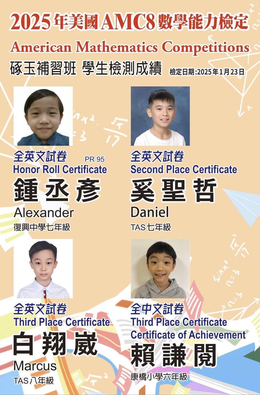 狂賀 !本校學生參加 2025全美中學數學8年級能力測驗 成績優異!!!